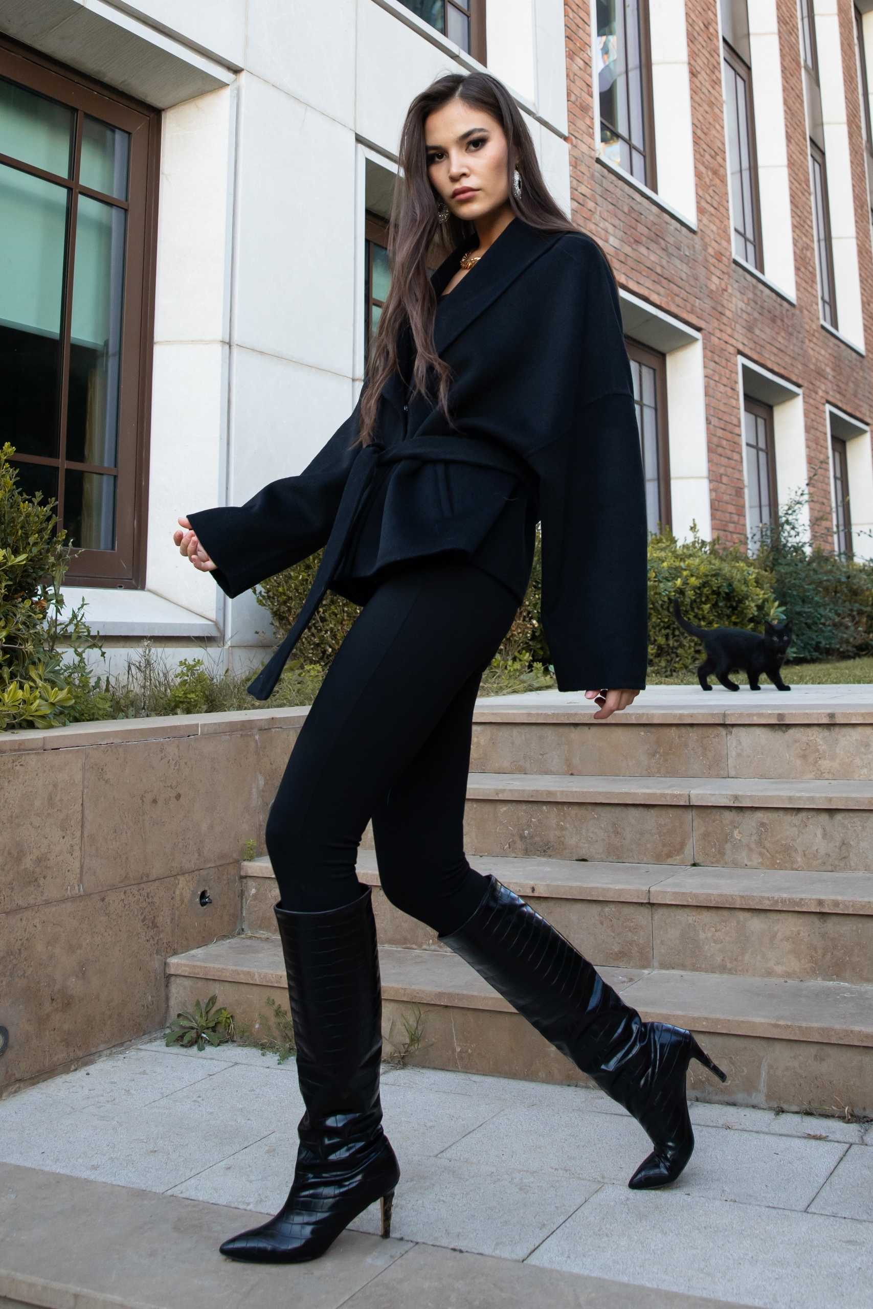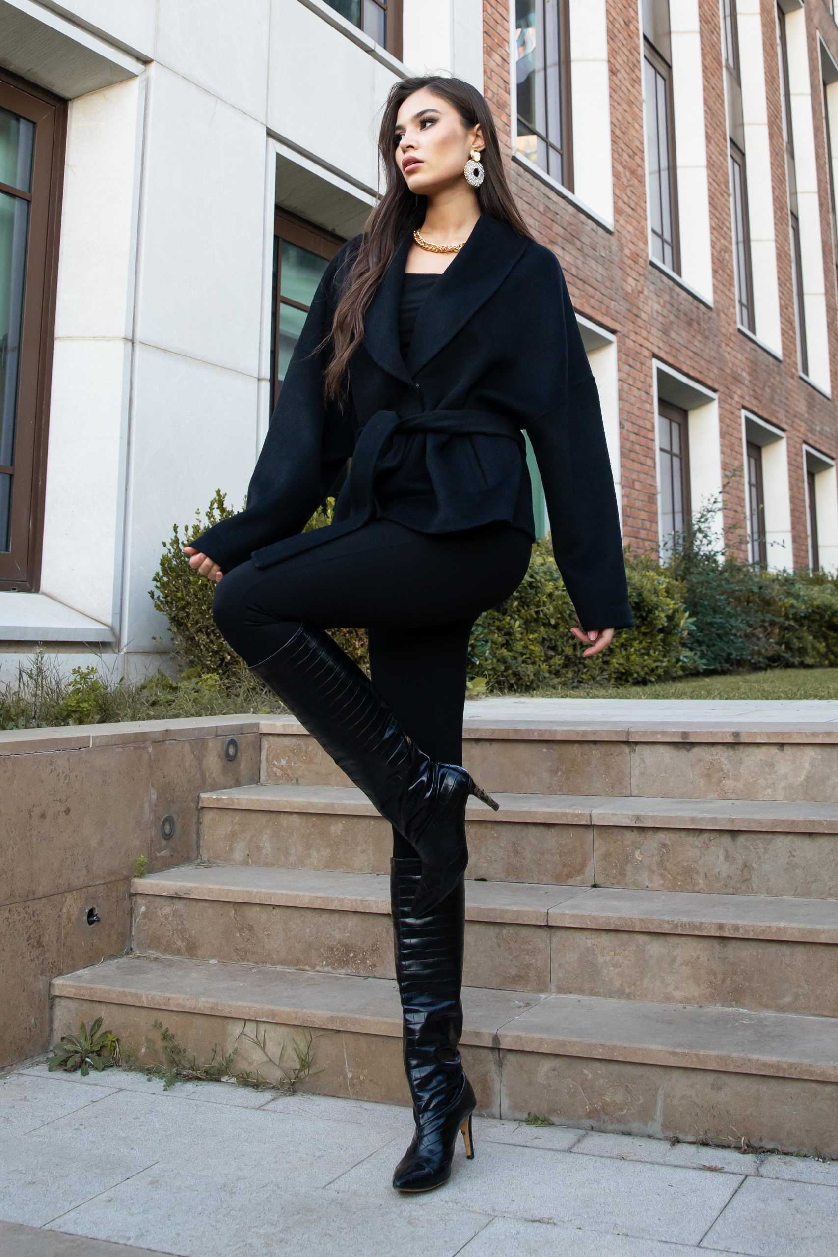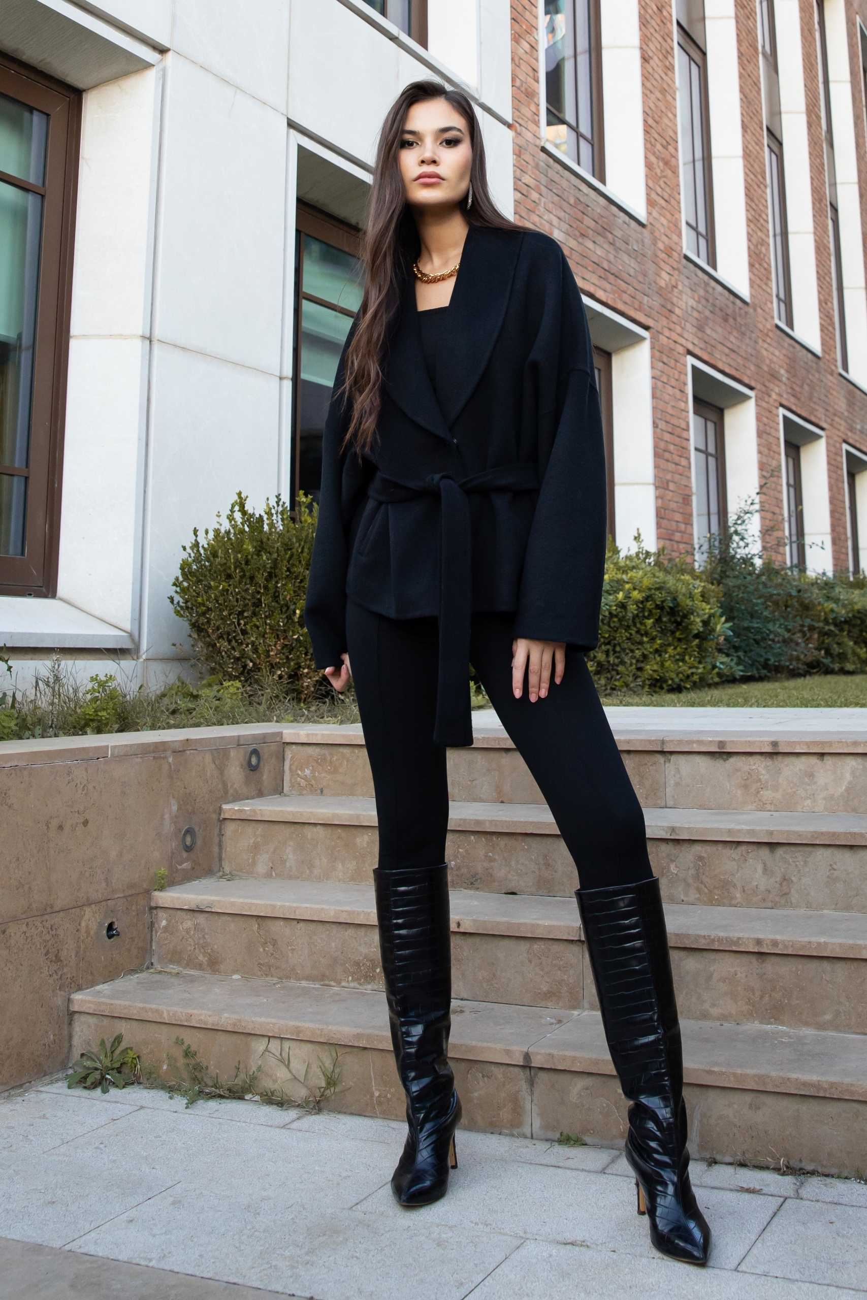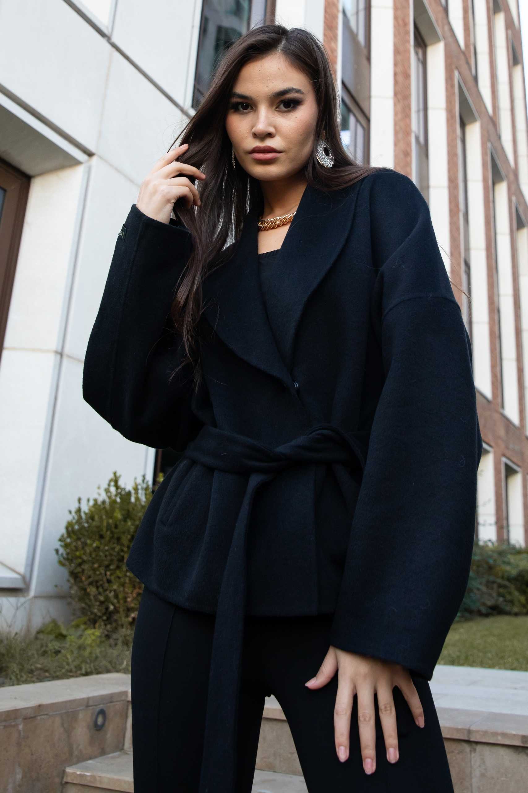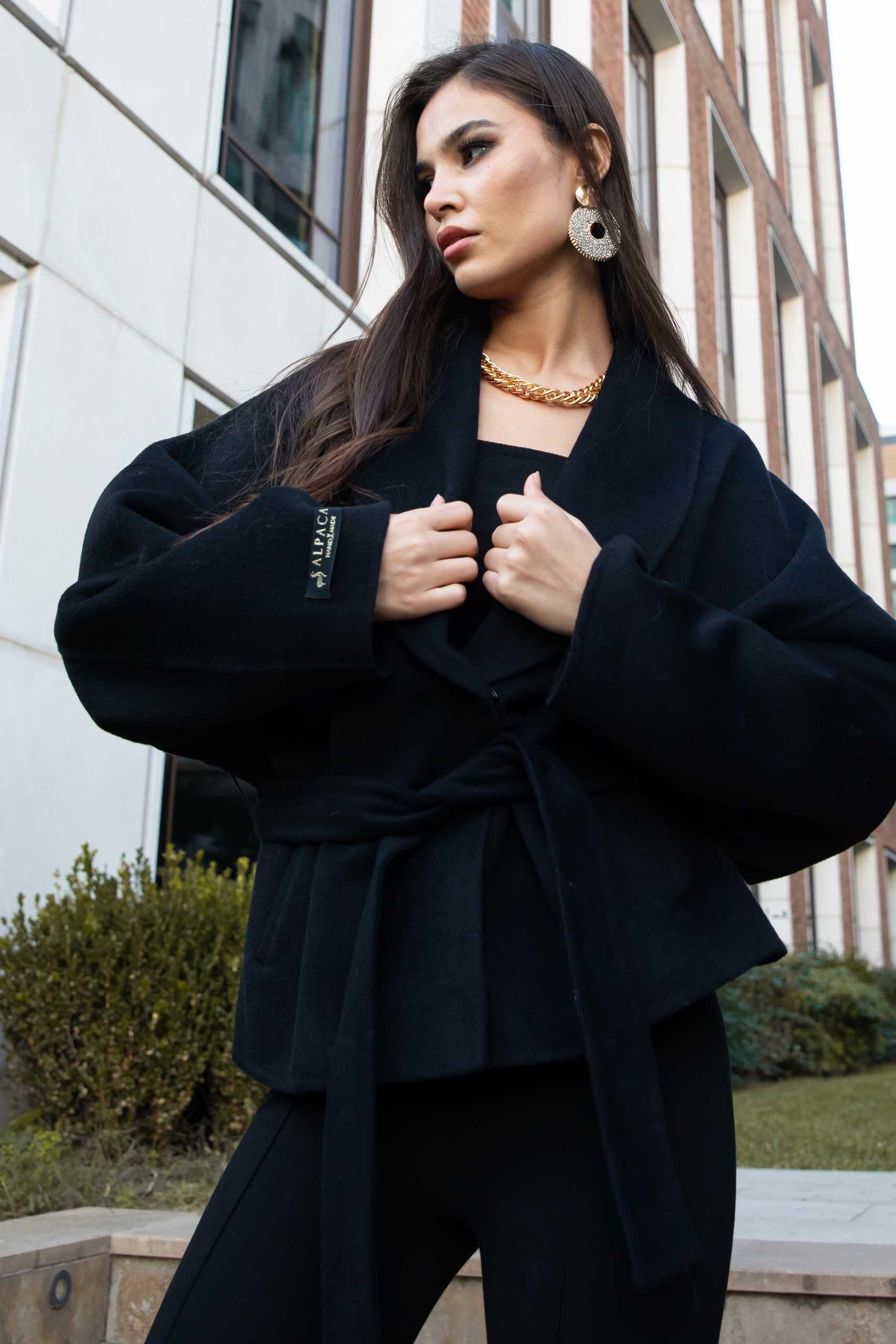 Kuşak bağlama ön kapamalı, yandan cepli; şal yaka tasarımlı sade kadın alpaka ceket.