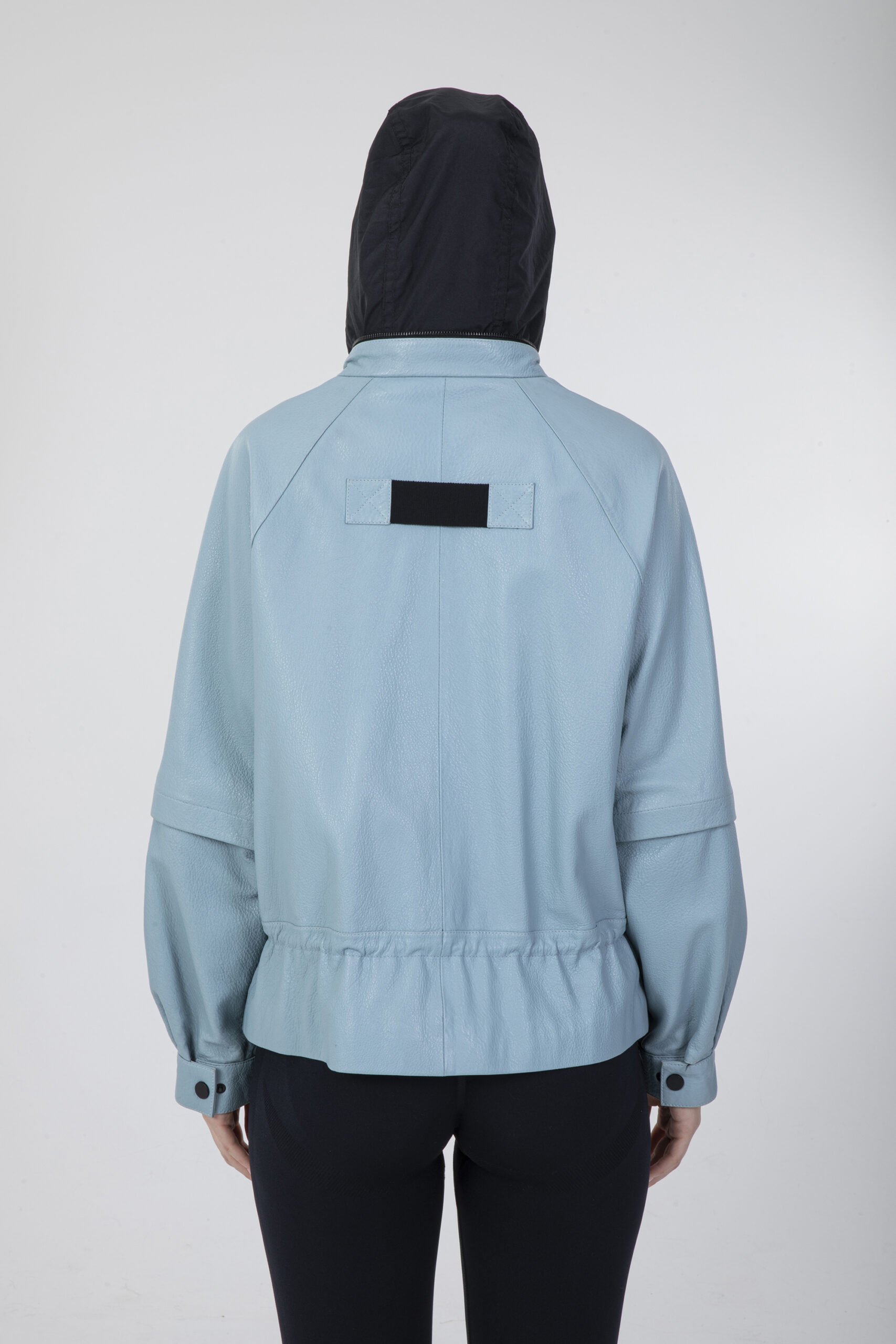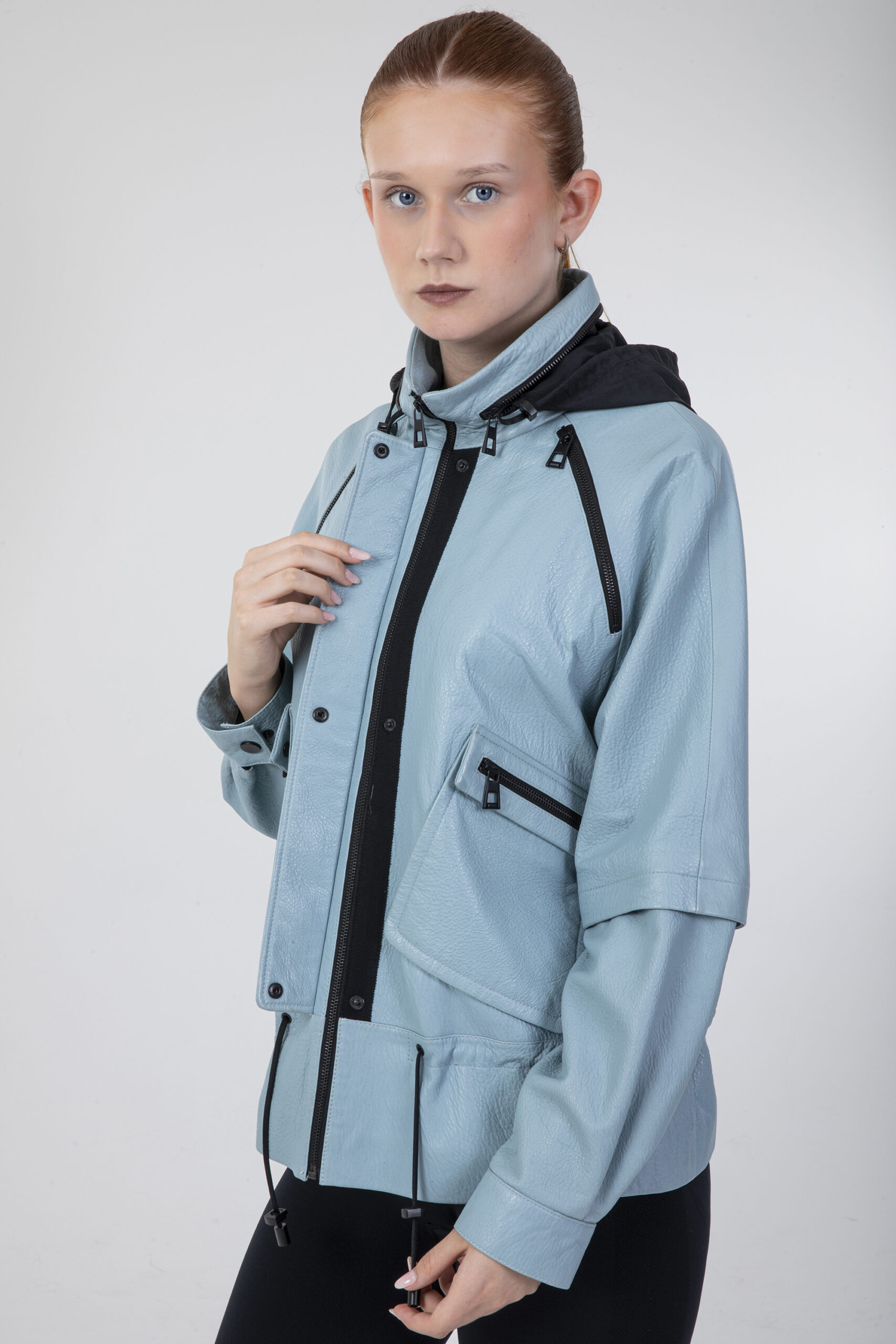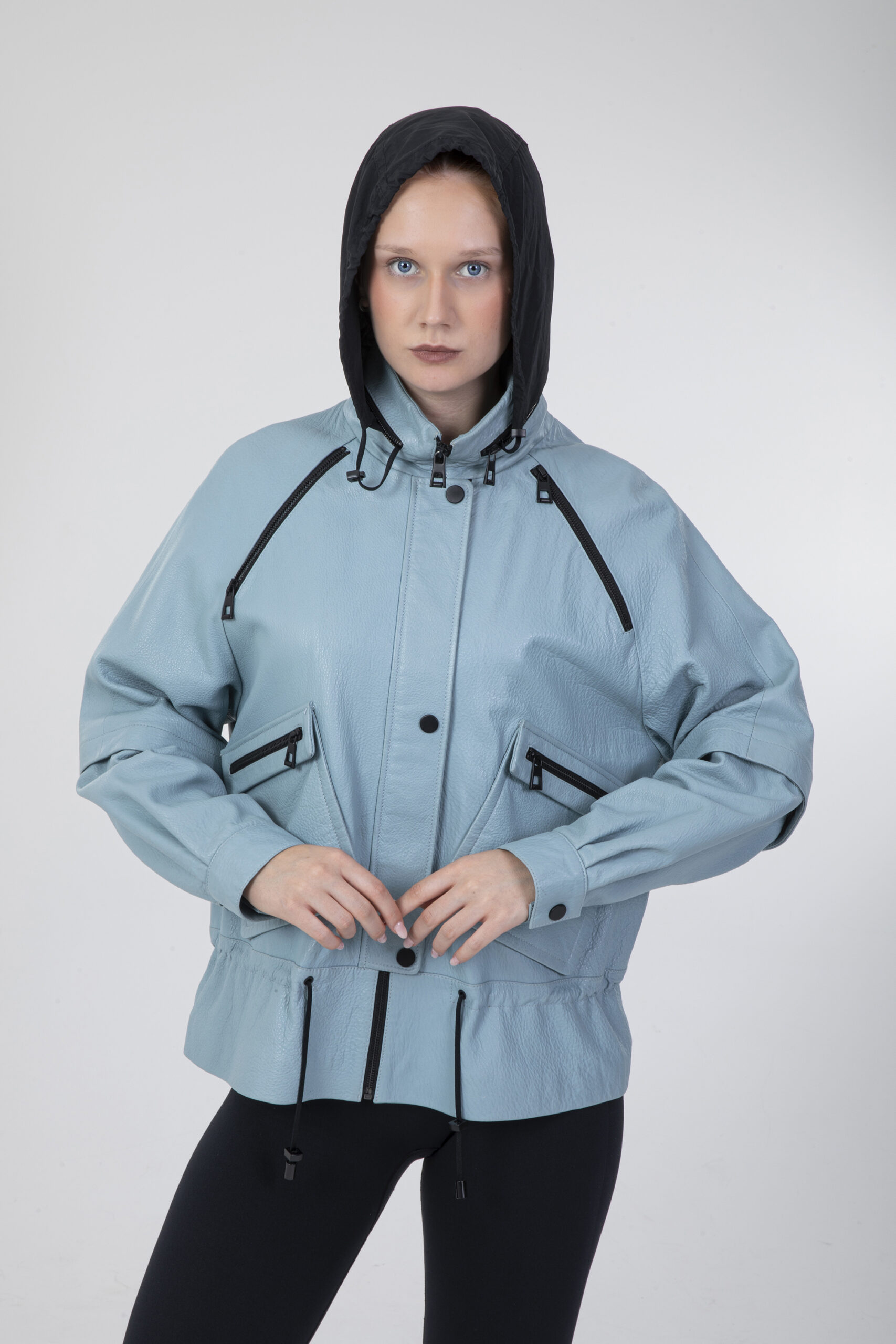 Fermuar Detaylı Gi̇zli̇ Kapşonlu Çıkma Kollu Astarlı Gerçek Deri̇ Ceket