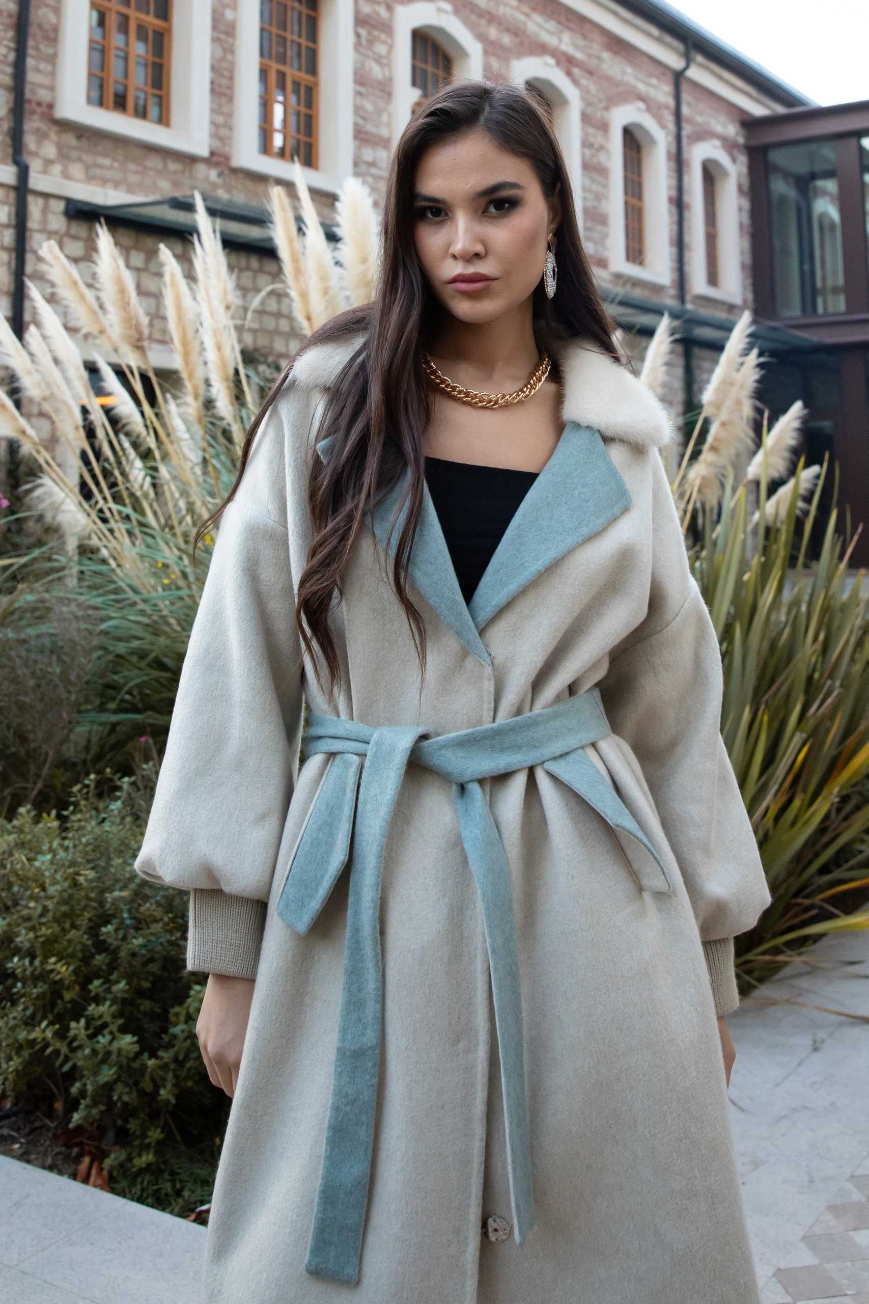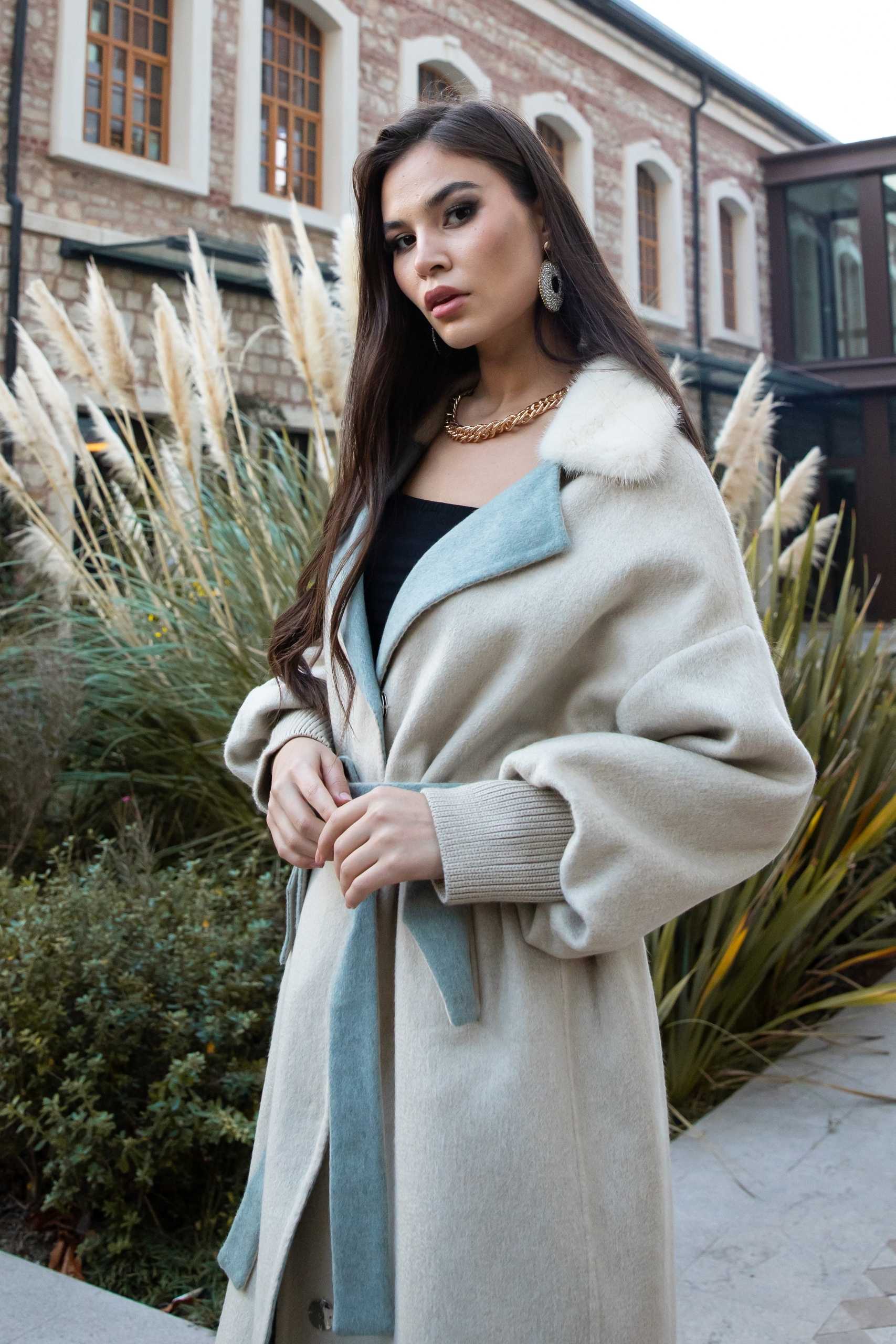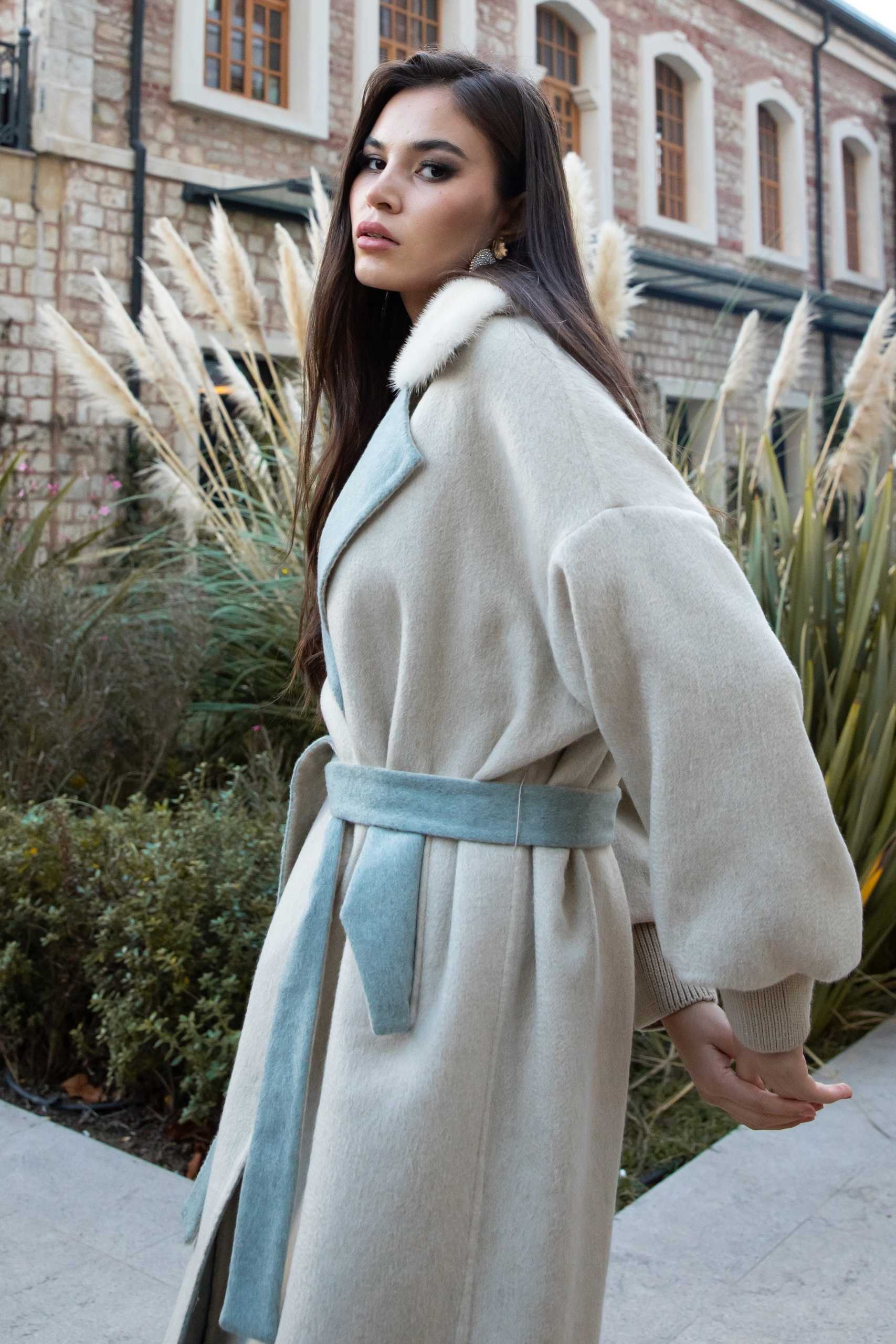 Kuşak kemer kapamalı, yandan cepli; %100 hakiki vizon kürklü, İngiliz yaka manto.