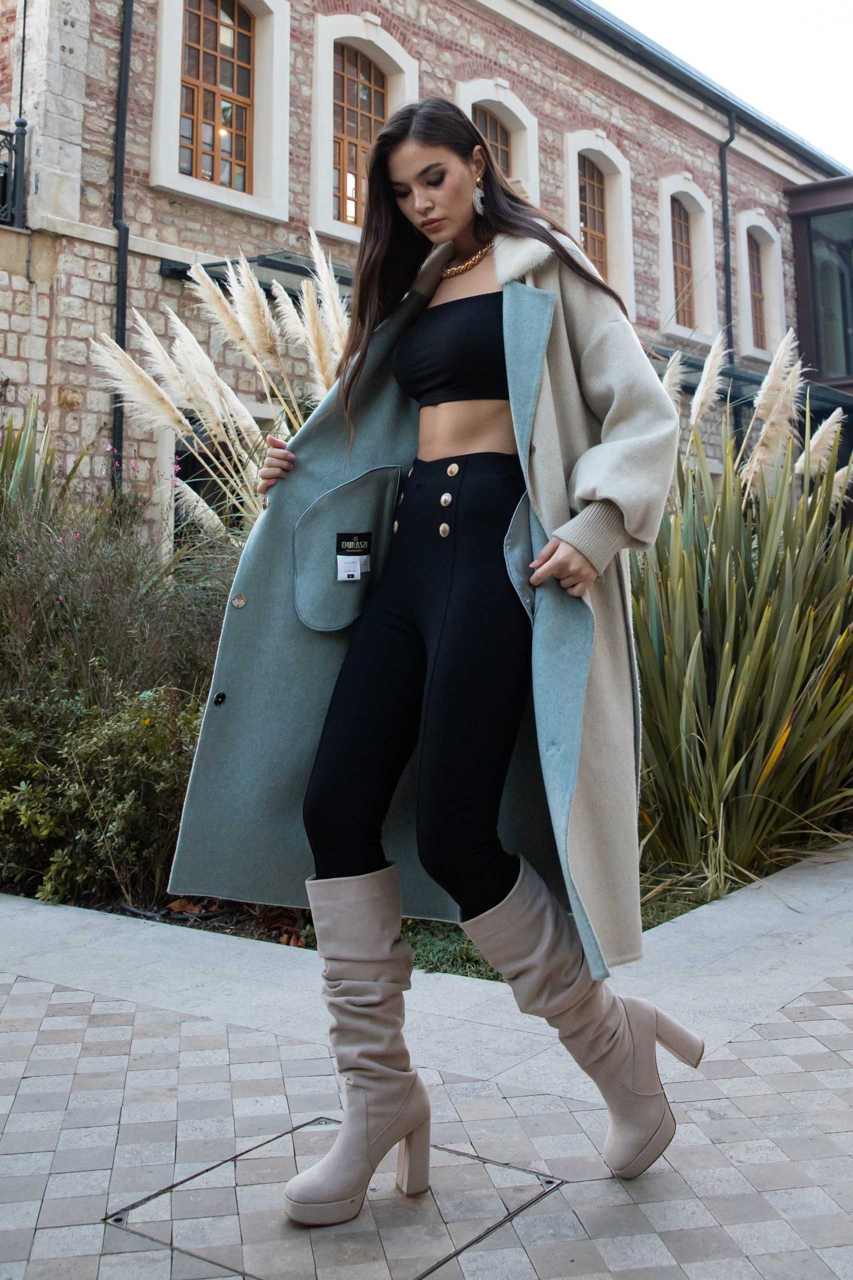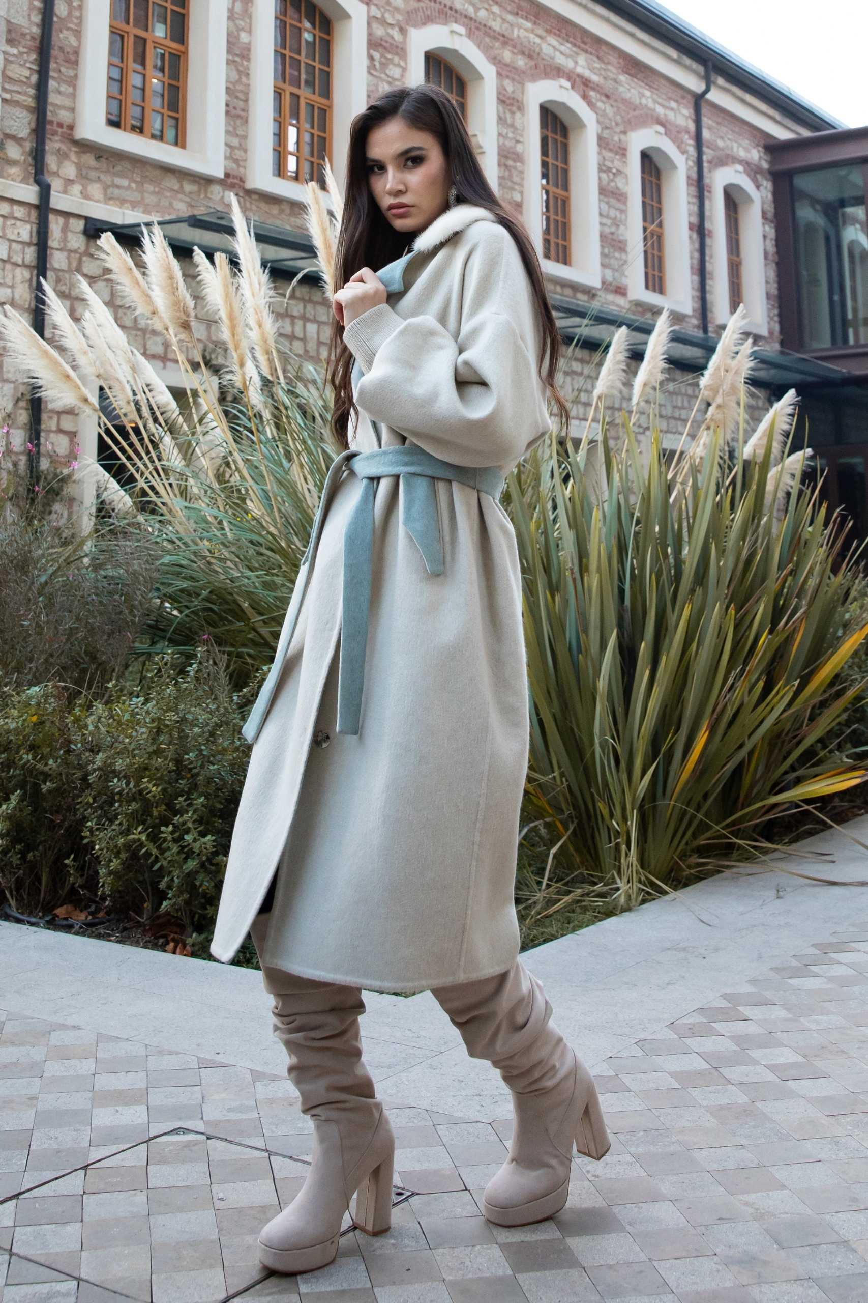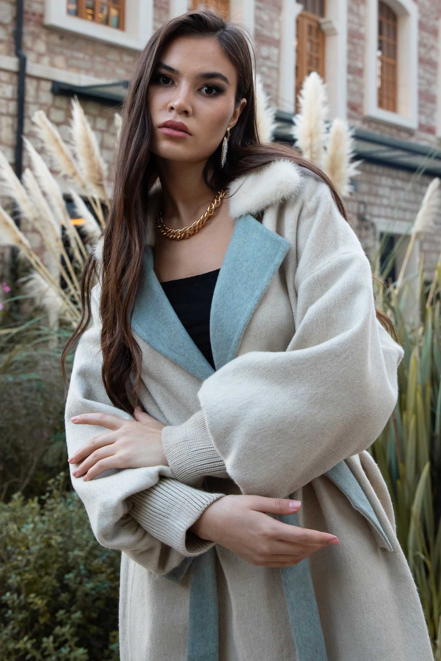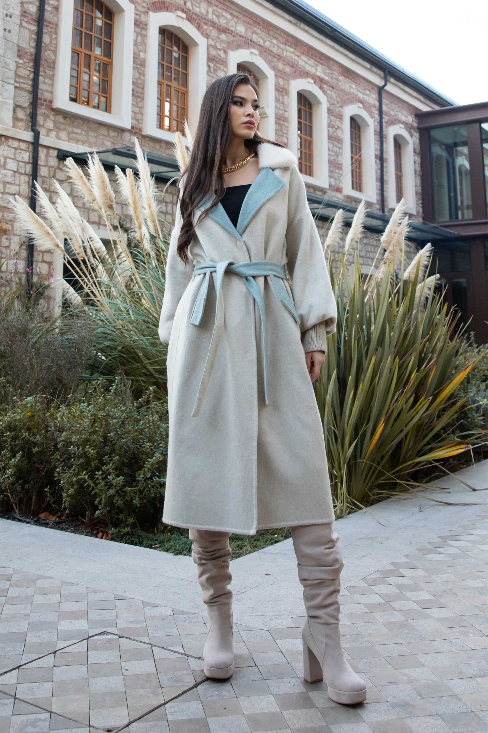 Kuşak kemer kapamalı, yandan cepli; %100 hakiki vizon kürklü, İngiliz yaka manto.